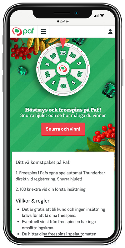 Paf har sitt säte på Åland och med licens där innebär det skattefria vinster. Med en välkomstbonus på 20 euro och 500 Paf gratissnurr är de nog ett casino i bottennivån vad gäller det. Även deras spelutbud är dåligt vad gäller spelautomater och livecasinot är i minsta laget. Men deras kompiskänsla höjer klart casinot. Mobilcasinot med 50 spel är däremot ett plus. Supporten som är öppen mellan 08.00 till 23.00 ger bra service men en livechat hade inte varit fel.